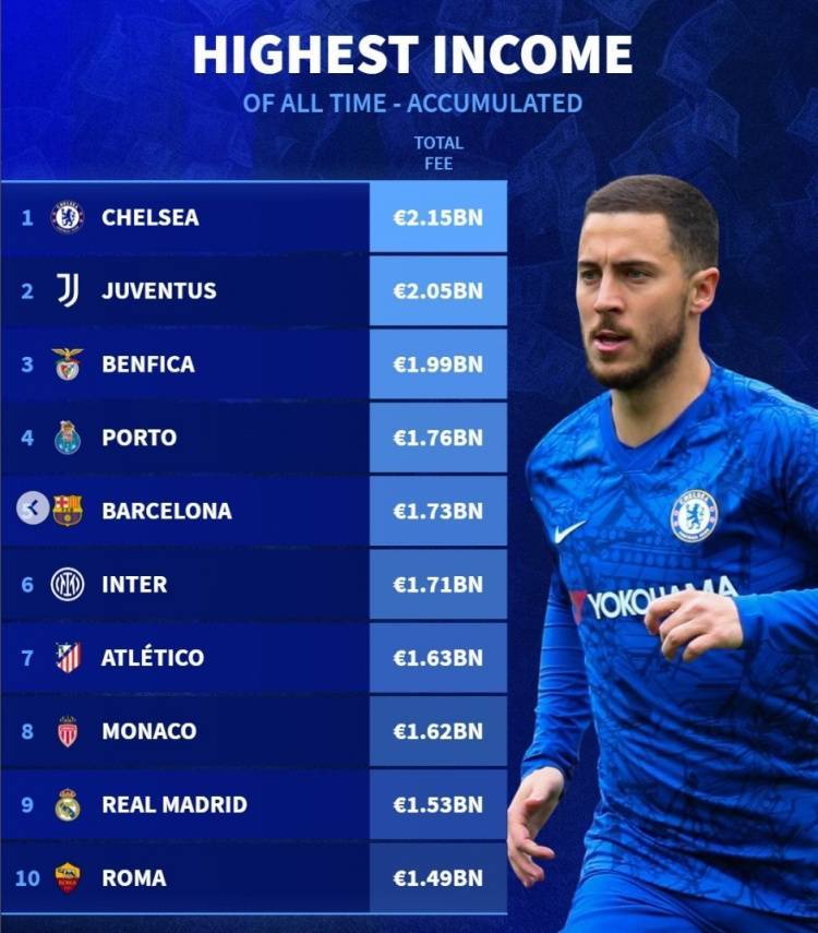 德转列历史转会费收入榜:切尔西居首,意甲西甲各3队&葡超2队
